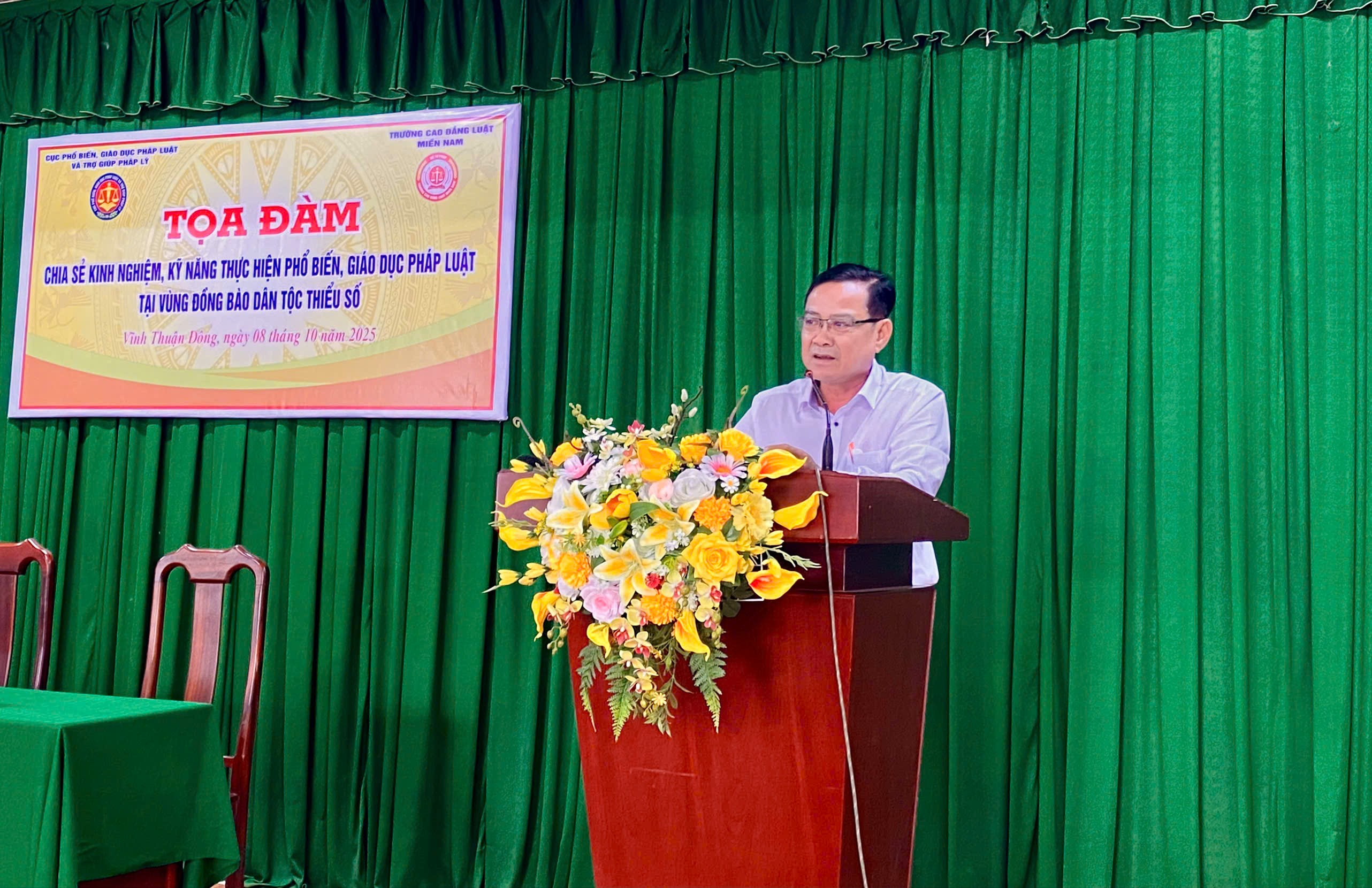 Tọa đàm chia sẻ kỹ năng, kinh nghiệm thực hiện phổ biến, giáo dục pháp luật tại vùng đồng bào dân tộc thiểu sốNgày 04/4/2024, Thủ tướng Chính phủ đã ban hành Quyết định số 279/QĐ-TTg phê duyệt Đề án “Nâng cao năng lực cho đội ngũ báo cáo viên pháp luật, tuyên truyền viên pháp luật thực hiện phổ biến, giáo dục pháp luật tại vùng đồng bào dân tộc thiểu số và miền núi giai đoạn 2024 - 2030”(sau đây gọi là Đề án 279). Đề án được xác định là một trong những giải pháp quan trọng nhằm ưu tiên xây dựng và củng cố nguồn nhân lực thực hiện công tác PBGDPL cho đồng bào dân tộc thiểu số, thúc đẩy triển khai các mô hình PBGDPL phù hợp với địa bàn cơ sở. Thực hiện Đề án 279, ngày 08/10/2025, Cục Phổ biến, giáo dục pháp luật và Trợ giúp pháp lý đã phối hợp với Trường Cao đẳng Luật miền Nam tổ chức Tọa đàm chia sẻ kỹ năng, kinh nghiệm thực hiện phổ biến, giáo dục pháp luật cho vùng đồng bào dân tộc thiểu số tại xã Vĩnh Thuận Đông, thành phố Cần Thơ. Tham dự và chủ trì tọa đàm có đồng chí Nguyễn Văn Phụng, Hiệu trưởng Trường Cao đẳng luật Miền Nam và đồng chí Nguyễn Thị Kim Loan, Phó Chủ tịch Ủy ban nhân dân xã Vĩnh Thuận Đông, với tham gia của các tuyên truyền viên pháp luật, trưởng thôn, trưởng ấp trên địa bàn xã.