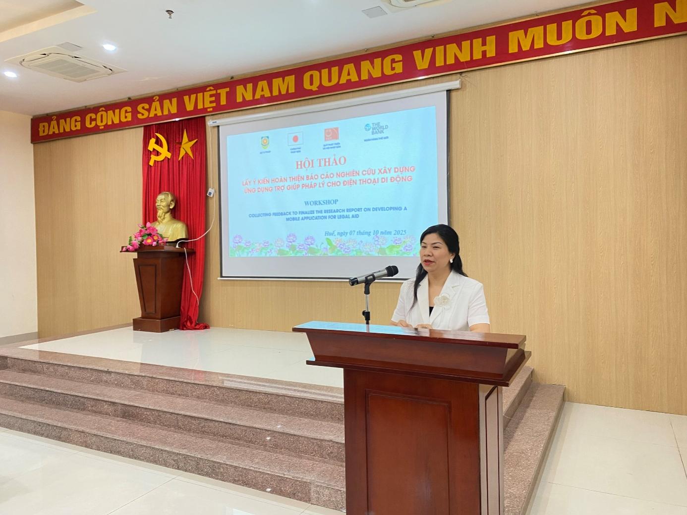Triển khai Kế hoạch dự án “Tăng cường trợ giúp pháp lý cho người nghèo và đối tượng yếu thế” do Ngân hàng Thế giới tài trợ từ nguồn hỗ trợ của Quỹ Phát triển xã hội Nhật Bản, ngày 07/10/2025, tại thành phố Huế, Cục Phổ biến giáo dục pháp luật và Trợ giúp pháp lý tổ chức Hội thảo tham vấn báo cáo nghiên cứu về ứng dụng trên điện thoại di động. Bà Tô Thị Thu Hà, Phó Cục trưởng chủ trì Hội thảo.