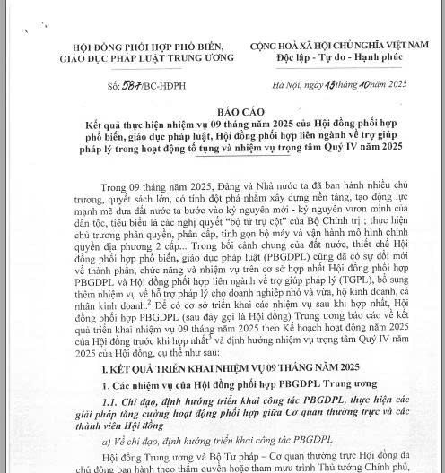 Ngày 04/8/2025, Thủ tướng Chính phủ đã ban hành Quyết định số 26/2025/QĐ-TTg để đổi mới thành phần, chức năng và nhiệm vụ trên cơ sở hợp nhất Hội đồng phối hợp phổ biến, giáo dục pháp luật (PBGDPL) và Hội đồng phối hợp liên ngành về trợ giúp pháp lý (TGPL), bổ sung thêm nhiệm vụ về hỗ trợ pháp lý cho doanh nghiệp nhỏ và vừa, hộ kinh doanh, cá nhân kinh doanh. Để có cơ sở triển khai các nhiệm vụ sau khi hợp nhất, ngày 13/10/2025, Hội đồng phối hợp PBGDPL Trung ương sau khi được kiện toàn theo Quyết định số 26/2025/QĐ-TTg đã ban hành Báo cáo số 587/BC-HĐPH về kết quả thực hiện nhiệm vụ 9 tháng năm 2025 của Hội đồng phối hợp phổ biến, giáo dục pháp luật, Hội đồng phối hợp liên ngành về trợ giúp pháp lý trong hoạt động tố tụng và nhiệm vụ trọng tâm Quý 4 năm 2025 của Hội đồng sau hợp nhất (sau đây gọi là Hội đồng).