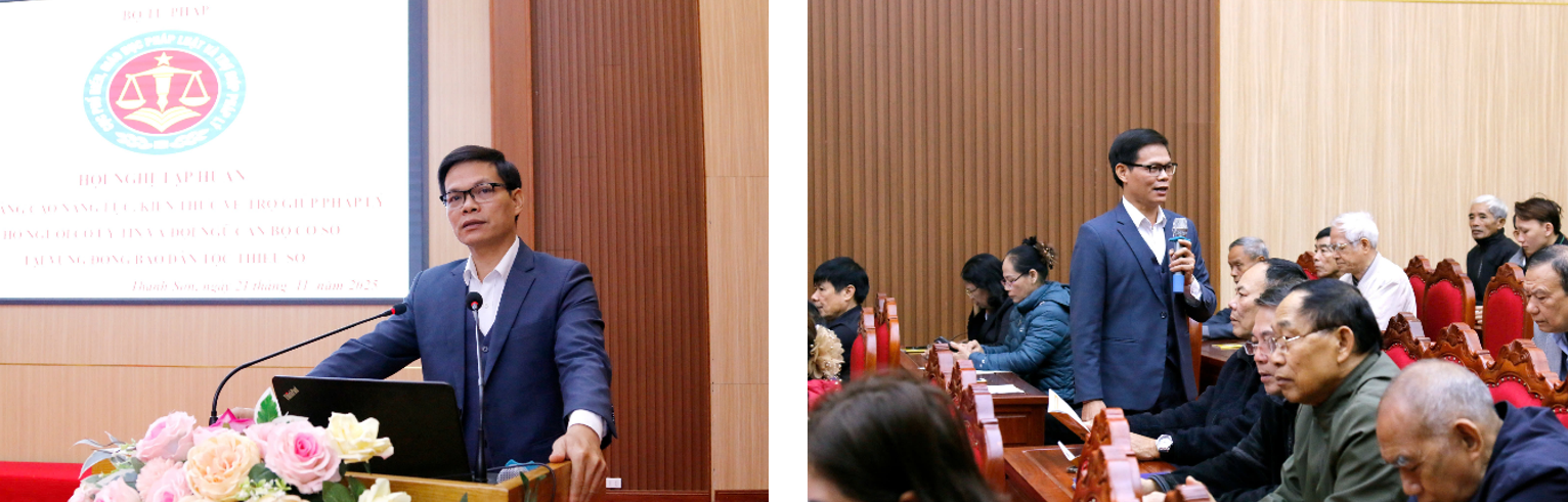 Các báo cáo viên đã trình bày các nội dung trọng tâm nhằm củng cố hiểu biết pháp luật cho đại biểu. Bằng phong thái từ tốn, dễ nghe, báo cáo viên bắt đầu bằng việc nhắc lại những nguyên tắc cốt lõi của trợ giúp pháp lý: tính nhân đạo, bình đẳng, tôn trọng, bảo mật thông tin của người được trợ giúp pháp lý, và đặc biệt là nguyên tắc “phi vụ lợi”. Mỗi nguyên tắc được liên hệ với những tình huống đời sống ở thôn bản, cách giảng giải không chỉ mang tính lý thuyết mà còn gắn với cuộc sống thực, giúp đại biểu dễ nhớ, dễ vận dụng. Cùng với đó, các báo cáo viên đã dành nhiều thời gian hướng dẫn kỹ năng hỗ trợ người dân tại cơ sở, bao gồm cách tiếp cận người dân trong bối cảnh văn hóa đặc thù, kỹ năng thu thập thông tin ban đầu, kỹ năng phối hợp giữa cán bộ thôn – xã với Trung tâm Trợ giúp pháp lý. Đại biểu được khuyến khích ứng dụng các công cụ truyền thông phù hợp như họp thôn, loa truyền thanh bản, sinh hoạt cộng đồng, và cả các kênh trực tuyến – những hình thức ngày càng phổ biến trong giới trẻ người dân tộc thiểu số. Để tư vấn hiệu quả, cán bộ thôn bản cần kiên nhẫn, tuyệt đối tránh áp đặt, và phải biết lắng nghe câu chuyện của người dân theo đúng tinh thần văn hóa từng dân tộc.