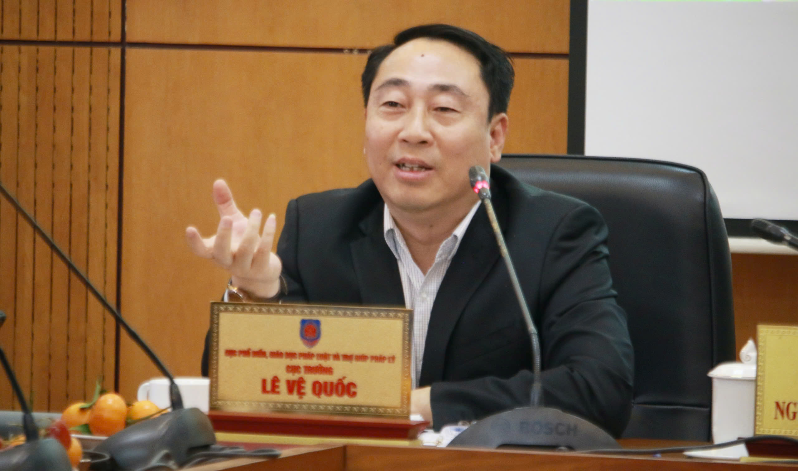 Cục trưởng Cục phổ biến, giáo dục pháp luật và trợ giúp pháp lý Lê Vệ Quốc phát biểu tại Hội nghị
