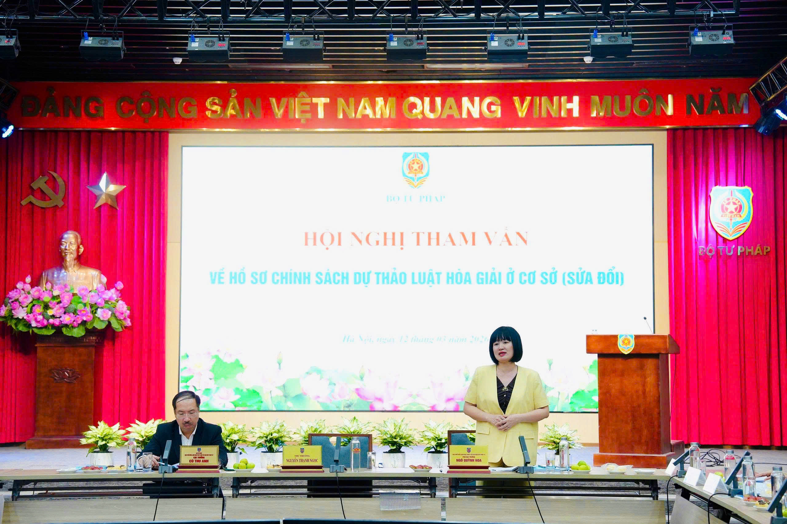 Báo cáo dẫn đề Hội nghị đồng chí Ngô Quỳnh Hoa, Phó Cục trưởng Cục Phổ biến, giáo dục pháp luật cho biết, trên cơ sở tổng kết thực tiễn thi hành Luật và tham khảo kinh nghiệm quốc tế, Bộ Tư pháp đã xây dựng dự thảo hồ sơ chính sách của Luật Hòa giải ở cơ sở (sửa đổi) với 5 nhóm chính sách lớn, bao gồm: