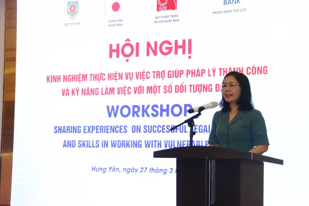 Phát biểu tại hội nghị, bà Vũ Thị Hường cho biết, dự án “Tăng cường trợ giúp pháp lý cho người nghèo và đối tượng yếu thế” do Ngân hàng Thế giới tài trợ từ Quỹ Phát triển xã hội Nhật Bản, do Bộ Tư pháp chủ trì, triển khai giai đoạn 2022–2026. Dự án có 4 hợp phần tập trung vào: Nâng cao khả năng tiếp cận trợ giúp pháp lý cho người dân ở cơ sở, người dễ bị tổn thương; nâng cao năng lực cho người thực hiện trợ giúp pháp lý và người có liên quan; nâng cao chất lượng công tác trợ giúp pháp lý; quản lý dự án, đánh giá và phổ biến thông tin.