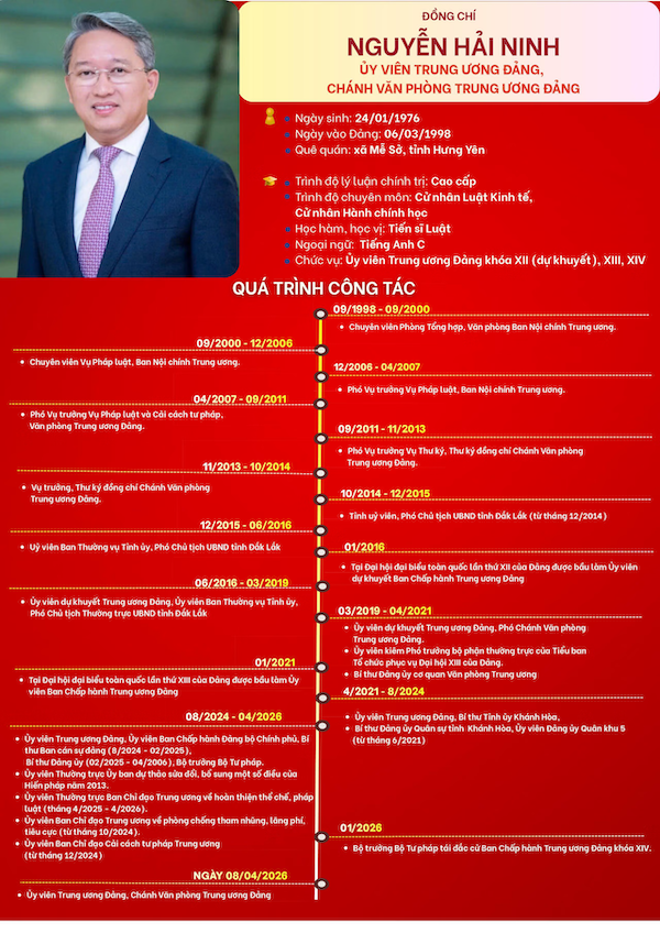 Sáng ngày 8/4, tại Trụ sở Trung ương Đảng, Bộ Chính trị đã trao quyết định điều động, phân công, bổ nhiệm đồng chí Nguyễn Hải Ninh, Ủy viên Ban Chấp hành Trung ương Đảng, Bộ trưởng Bộ Tư pháp giữ chức Chánh Văn phòng Trung ương Đảng. Cổng thông tin điện tử Bộ Tư pháp trân trọng giới thiệu tóm tắt tiểu sử của đồng chí Nguyễn Hải Ninh, Chánh Văn phòng Trung ương Đảng.