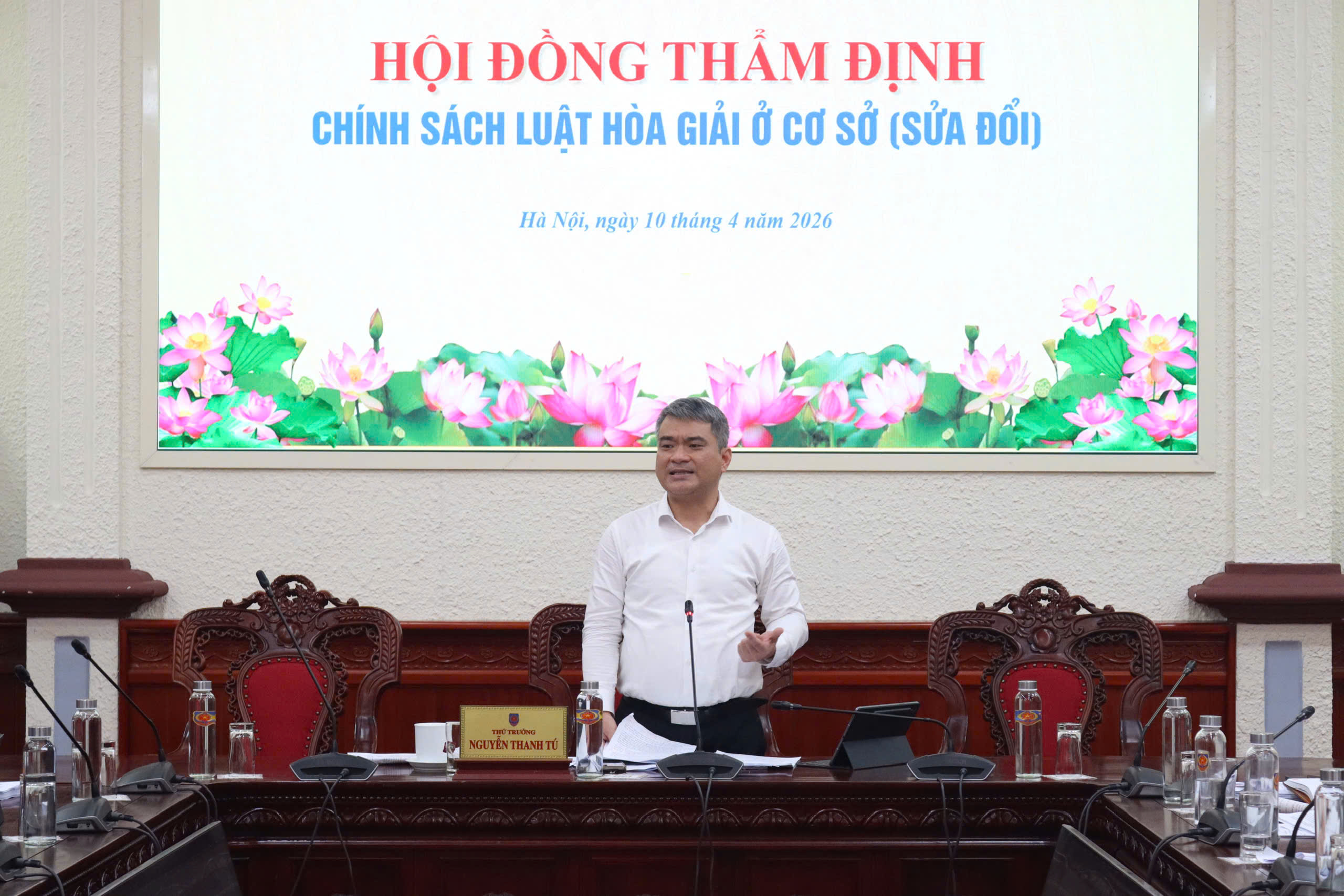 Chiều ngày 10/4/2026 tại trụ sở Bộ Tư pháp, Thứ trưởng Bộ Tư pháp Nguyễn Thanh Tú chủ trì cuộc họp Hội đồng thẩm định hồ sơ chính sách của Luật Hòa giải ở cơ sở (sửa đổi). Tham gia cuộc họp Hội đồng thẩm định chính sách có đại diện các bộ, cơ quan, tổ chức ở Trung ương (Tòa án nhân dân tối cao, Cơ quan Ủy ban Trung ương Mặt trận Tổ quốc Việt Nam, Văn phòng Chính phủ, Bộ Công an, Bộ Quốc phòng, Bộ Nội vụ, Bộ Tài chính, Bộ Khoa học và Công nghệ, Bộ Văn hóa, Thể thao và Du lịch, Trung ương Hội Cựu Chiến binh Việt Nam, Trung ương Hội Người cao tuổi Việt Nam và đại diện Liên đoàn Luật sư Việt Nam); đại diện Ủy ban nhân dân TP. Hà Nội và một số đơn vị thuộc Bộ Tư pháp.