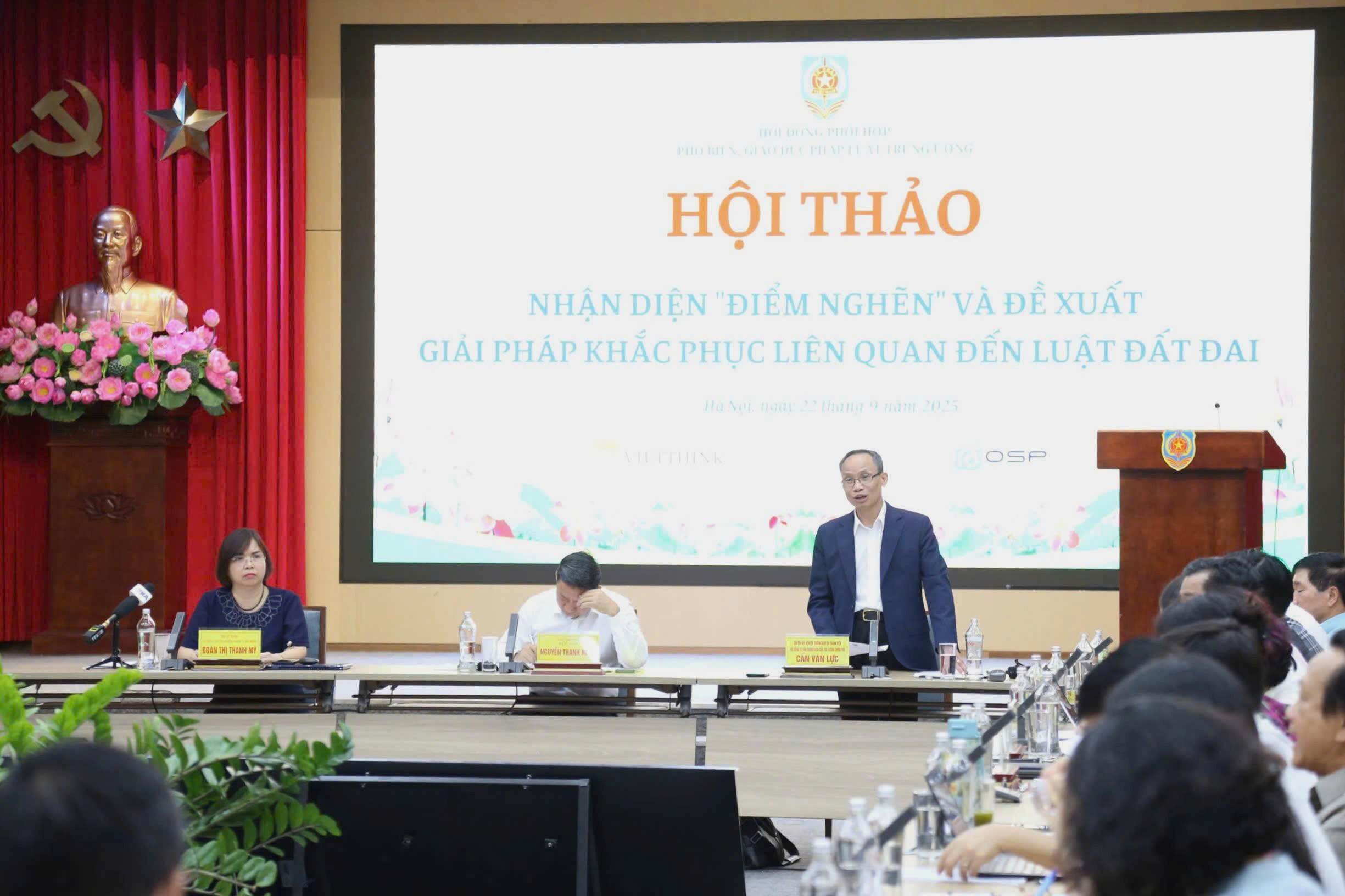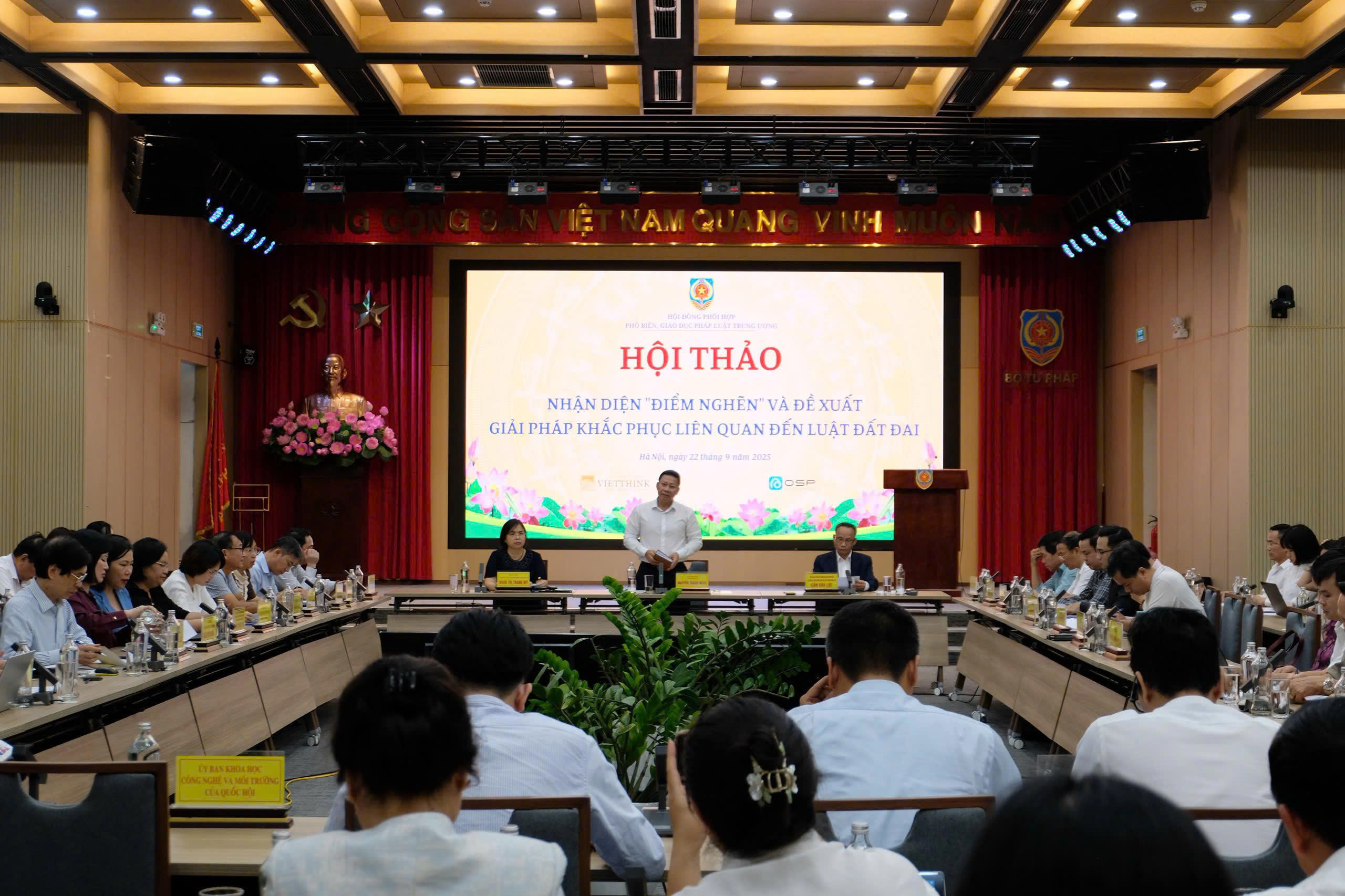 Chiều ngày 22/9, tại trụ sở Bộ Tư pháp, Bộ Tư pháp phối hợp cùng Bộ Nông nghiệp và Môi trường tổ chức Hội thảo “Nhận diện điểm nghẽn và đề xuất giải pháp khắc phục liên quan đến lĩnh vực đất đai”. Hội thảo là diễn đàn chuyên sâu nhằm nhận diện, phân tích, trao đổi những khó khăn, vướng mắc trong thể chế và công tác tổ chức thi hành pháp luật đất đai, đồng thời đề xuất giải pháp đột phá tháo gỡ điểm nghẽn, tạo tiền đề cho việc hoàn thiện thể chế đất đai, góp phần hỗ trợ doanh nghiệp và thúc đẩy phát triển kinh tế - xã hội trong giai đoạn tới.