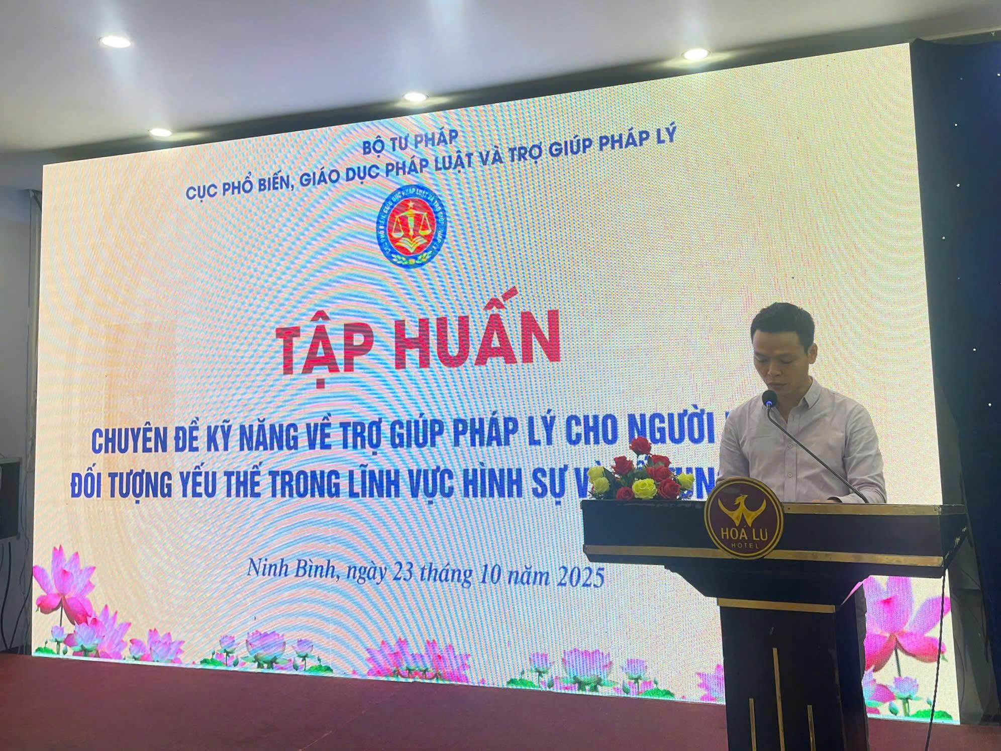 Chính vì vậy, nhằm thực hiện hiệu quả Chương trình mục tiêu quốc gia giảm nghèo bền vững (thuộc Dự án 7: Nâng cao năng lực, giám sát và đánh giá Chương trình), ngày 23 tháng 10 năm 2025, tại tỉnh Ninh Bình, Cục Phổ biến, giáo dục pháp luật và Trợ giúp pháp lý đã tổ chức Hội nghị tập huấn chuyên đề kỹ năng trợ giúp pháp lý cho người nghèo, đối tượng yếu thế trong lĩnh vực hình sự và tố tụng hình sự.