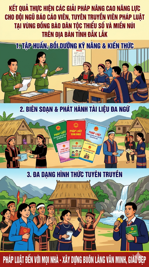 Bên cạnh các lớp tập huấn chuyên đề, các sở, ngành, địa phương đã lồng ghép nội dung bồi dưỡng kiến thức pháp luật, kỹ năng tuyên truyền cho đội ngũ BCV, TTV pháp luật trong quá trình thực hiện nhiệm vụ chuyên môn; phát hành các ấn phẩm, tài liệu tuyên truyền pháp luật (tờ rơi, tờ gấp, sổ tay...) cấp phát cho cán bộ, đội ngũ BCV, TTV pháp luật và Nhân dân trên địa bàn tỉnh, đặc biệt là vùng đồng bào dân tộc thiểu số và miền núi; phát các chuyên trang, chuyên mục trên hệ thống truyền thanh cơ sở, nhất là tại các thôn, buôn đồng bào dân tộc thiểu số và miền núi, vùng sâu, vùng xa, vùng đặc biệt khó khăn; sử dụng loa lưu động song ngữ (tiếng Việt và tiếng Êđê),… Ngoài ra, Sở Nội vụ, Sở Dân tộc và Tôn giáo thường xuyên tổ chức các lớp đào tạo, bồi dưỡng tiếng dân tộc (Êđê), cập nhật kiến thức về công tác dân tộc cho đội ngũ cán bộ, công chức nói chung và đội ngũ BCV, TTV pháp luật ở cơ sở nói riêng, góp phần nâng cao hiệu quả PBGDPL tại vùng đồng bào dân tộc thiểu số và miền núi.