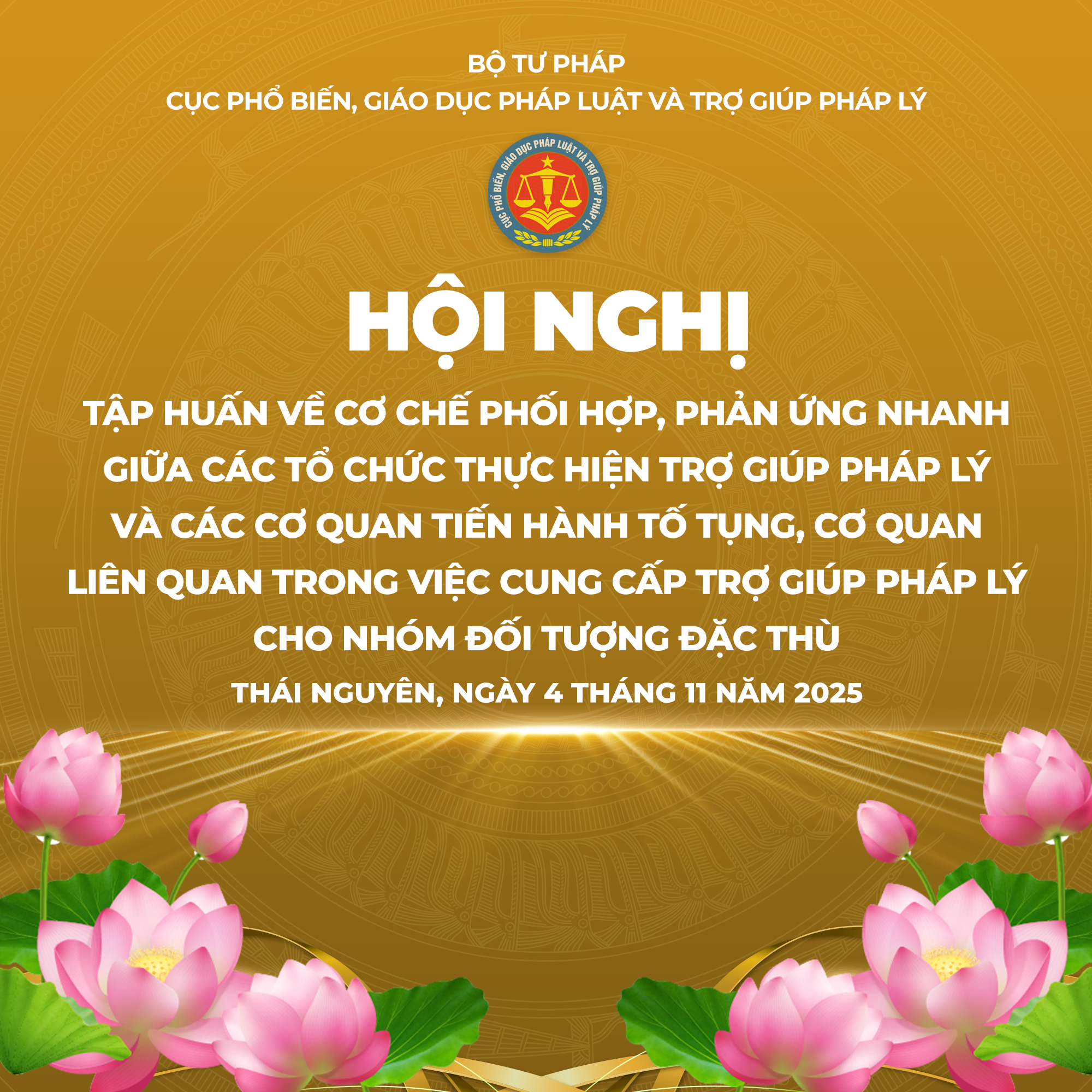 Sáng ngày 04/11, Cục Phổ biến, giáo dục pháp luật và Trợ giúp pháp lý (Bộ Tư pháp) sẽ tổ chức Hội nghị tập huấn về cơ chế phối hợp, phản ứng nhanh giữa các tổ chức thực hiện trợ giúp pháp lý và các cơ quan tiến hành tố tụng, cơ quan liên quan trong việc cung cấp trợ giúp pháp lý cho nhóm đối tượng đặc thù, tại Thái Nguyên.