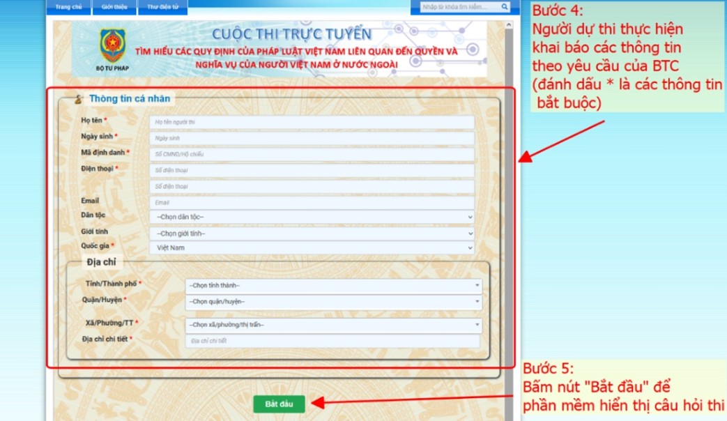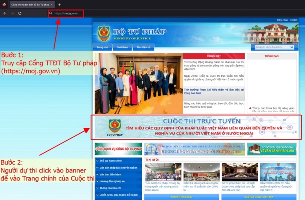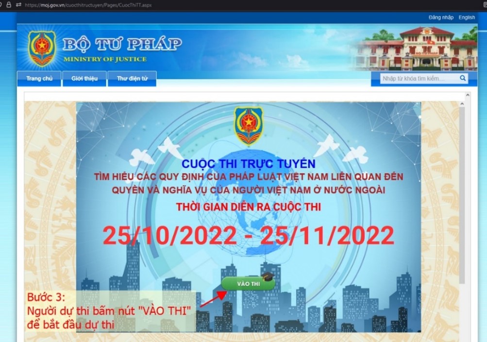 Để tham gia Cuộc thi trực tuyến “Tìm hiểu các quy định của pháp luật Việt Nam liên quan đến quyền và nghĩa vụ của người Việt Nam ở nước ngoài” (sau đây gọi là Cuộc thi), người dự thi cần lưu ý và thực hiện theo hướng dẫn sau: